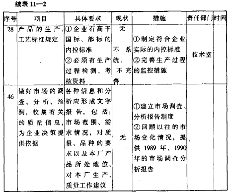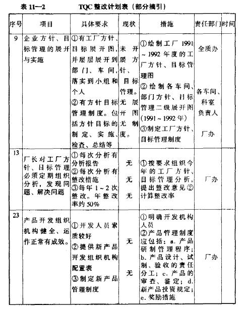 在這份整改計劃中,具體提出了工廠在推行全面質量管理中,應著手10個方面,共53項具體工作的內容,并與企業商定、落實了各項具體工作的執行部門及要求。整個計劃以表格形式列出,直觀、具體、清楚,共計數十頁。限于篇幅,這里只把整改計劃中提出的10個方面的工作列出,并摘錄整改計劃表中的一些具體條目列于后,使讀者由此對整個全面質量管理整改計劃的全貌,可以有一個大致的了解。