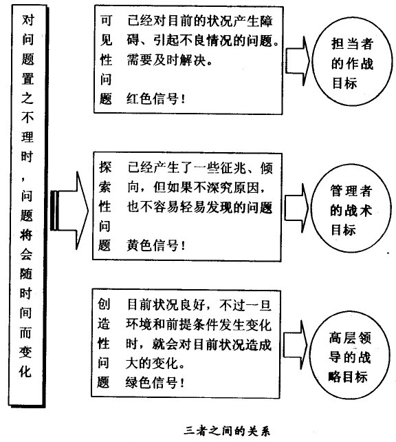 在上圖中,不同的問題對應著不同層次的目標。盡管隨著時間的推移問題會發生變化,但企業里不同層次的員工需要解決的問題是不變的,既高層領導解決創造性的問題、中層管理害解決探索性問題、擔當者解決可見性問題。同時,與之相對應的目標便依次是戰略目標、戰術目標和作戰目標。