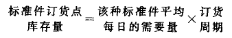 (3)定貨點儲備量。在倉庫向生嚴部門提出訂貨時,最理想的狀況是下批標準件的產出入庫時間剛好在上批快要用完的時候,因而需要確定訂貨點儲備員。所謂訂貨點、就是標準件庫存量的一個限度,當標準件逐漸領用到接近這個限度(即達到訂貨點時),就要把下—批標淮件投入生產。訂貨點儲備量計算公式如下: