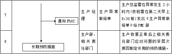 6. 對可能影響的生產進度,由生產經理在異常發生2小時內(夜班則在第二天早上8:30前)填寫《生產異常聯絡單》詳細向PMC部報告。