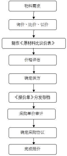 5.1.7采購員獲取《報價單》后,制作《原材料比議價表》,(除特殊物料、大宗物料、專項費用無法制作《原材料比議價表》外),同《報價單》一起交采購部經理,采購部經理按《原材料比議價表》、《報價單》、《購銷合同》或《采購訂單》,對單價、交貨方式、稅票、品質、供貨能力等進行評估,必要時,可進行市場調查。采購部經理審核確定供方及價格后,《報價單》交采購員回傳至供方。復印三份,一份交財務,一份交采購經理、一份自存。