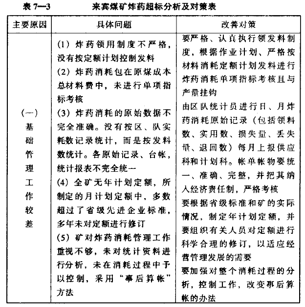 咨詢組通過對影響炸藥消耗主要影響因素的詳細分析,從狠抓內部管理,挖掘內部潛力人手,制定了降耗的措施方案,見來賓煤礦炸藥消耗超標分析及對策表(表7-3)