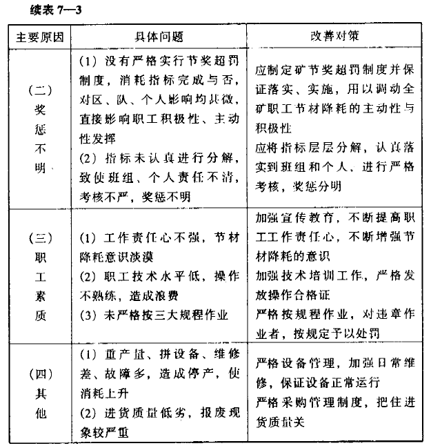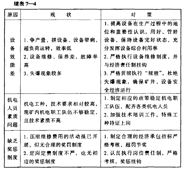 我省煤炭企業配件消耗的省級定額標準為1.0元/噸,來賓煤礦實際消耗值為1.01元/噸,超耗。雖然超耗幅度不大,但對全礦材料消耗達標,仍具較大影響。因此,咨詢組認真收集整理本礦的有關原始數據和資料,進行了認真分析。通過分析,咨詢組認為,造成本礦配件消耗高的主要因素有兩個方面。一是財務部門在對配件消耗費用的劃分上不夠準確;二是全礦機電設備管理工作尚有差距。據此,咨詢組提出以下改善建議:(1)礦財務部門要嚴格按照國家和上級主管部門規定,進行礦山配件消耗的統計和費用分攤,以期分攤費用盡量合理、準確。(2)切實加強全礦機電設備管理工作,保證設備正常安全運行,減少設備磨損和故障,降低配件消耗。在對本礦機電設備管理工作進行詳細調查、分析的基礎上,提出了改善本礦機電設備管理工作的建議方案,供礦山在進行整改工作時參照執行(參見表7-4)