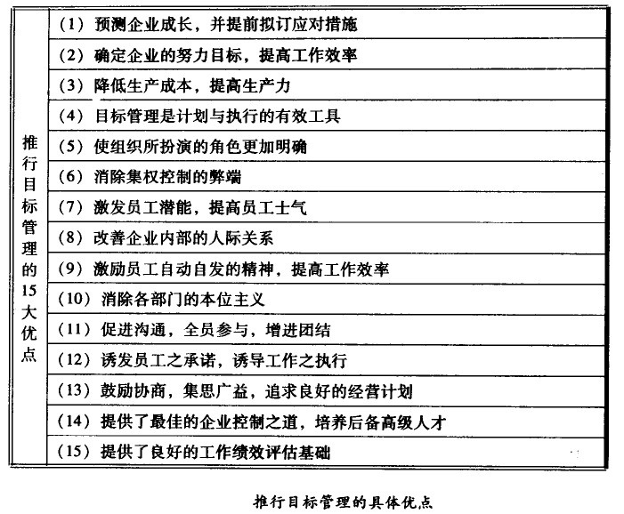 與傳統的企業經營方法相比,改進經營管理的方式是目標管理景突出的憂點。如果沒有目標或沒有成果導向的計劃,就無法建立可以評價及可行動的方案,因此目標管理強迫經營者必須設法計劃出準備取得的成果,而不僅僅限于行動或工作。經營者除了必須考慮如何去完成成果以及所需的資源或成員外,甚至所需的部門間協助以及應予控制納要點均應考慮在內,以保證目標的實現。推行目標管理的具體優點如圖所示: