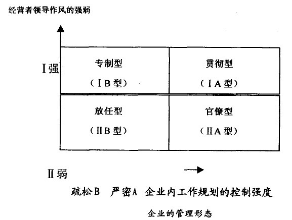 依照經營者的領導作風和企業工作規劃這兩個指標,可以把企業的管理形態劃分為以下四類:貫徹型、專制型、官僚型、放任型。