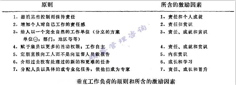 工作豐富化也稱為垂直工作負荷,因為,按照這個過程,一個人的職務被加上—高一級的任務。斯坎倫總結了垂直工作負荷的基本要素或原則。在理想上,豐富化的每一個方面至少對一種工作激勵因素(或滿足因素)有吸引力。下圖就是這些關系的總結。