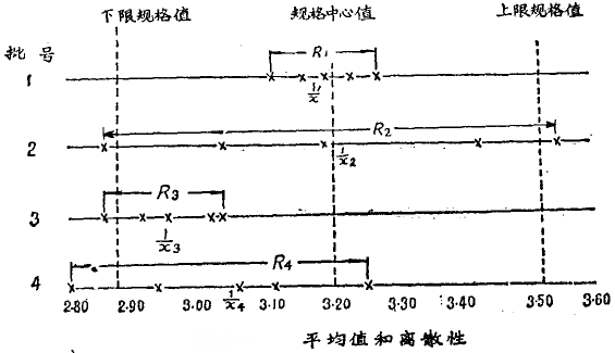 圖可以看出,第一批的平均值接近技術標推的中央值,離散性也不大。第二批的平均值雖然也接近于技術標準的中央值,但離散性大,在五個數據當中有兩個數據是在技術標準的界限之外。第三批雖然離散性較小,但是平均值卻距離技術標準的中央值較遠,并且靠近技術標界限的下限。第四批不但離散性較大,而且平均值從技術標的中央值來看,有些過于靠左。